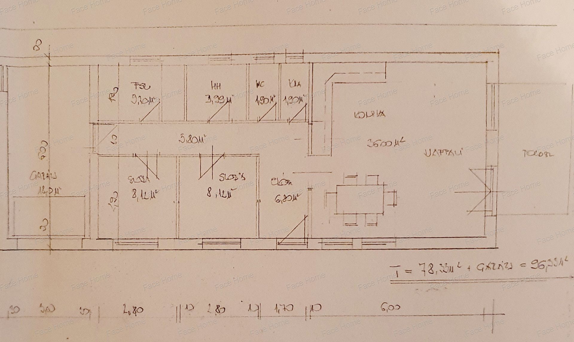 HELYISÉGLISTA: előtér (6,8 nm), nappali-étkező-konyha (36 nm), kamra (1,9 nm), 2 szoba (8,12 nm, 12 nm), fürdőszoba (9,2 nm), külön WC (1,9 nm), közlekedő (5,8 nm), garázs (18 nm), terasz.